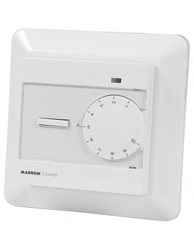 Możesz wybrać również manualny sterownik MAGNUM HEATING Standard Control. Urządzenie posiada jedynie dwa widoczne przyciski (włącznik i pokrętło regulacji temperatury), dzięki czemu jest bardzo prosty w obsłudze i nie istnieje ryzyko przypadkowej zmiany ustawień. Dodatkowo termostat posiada odpowiednie zabezpieczenia, które uniemożliwiają uszkodzenie systemu ogrzewania. W zestawie znajdują się dwa rodzaje obudowy (zaokrąglona i kwadratowa), dzięki temu możesz dopasować wygląd termostatu do przełączników lub własnego gustu. Ten termostat również posiada dwa czujniki temperatury (powietrzny i podłogowy).