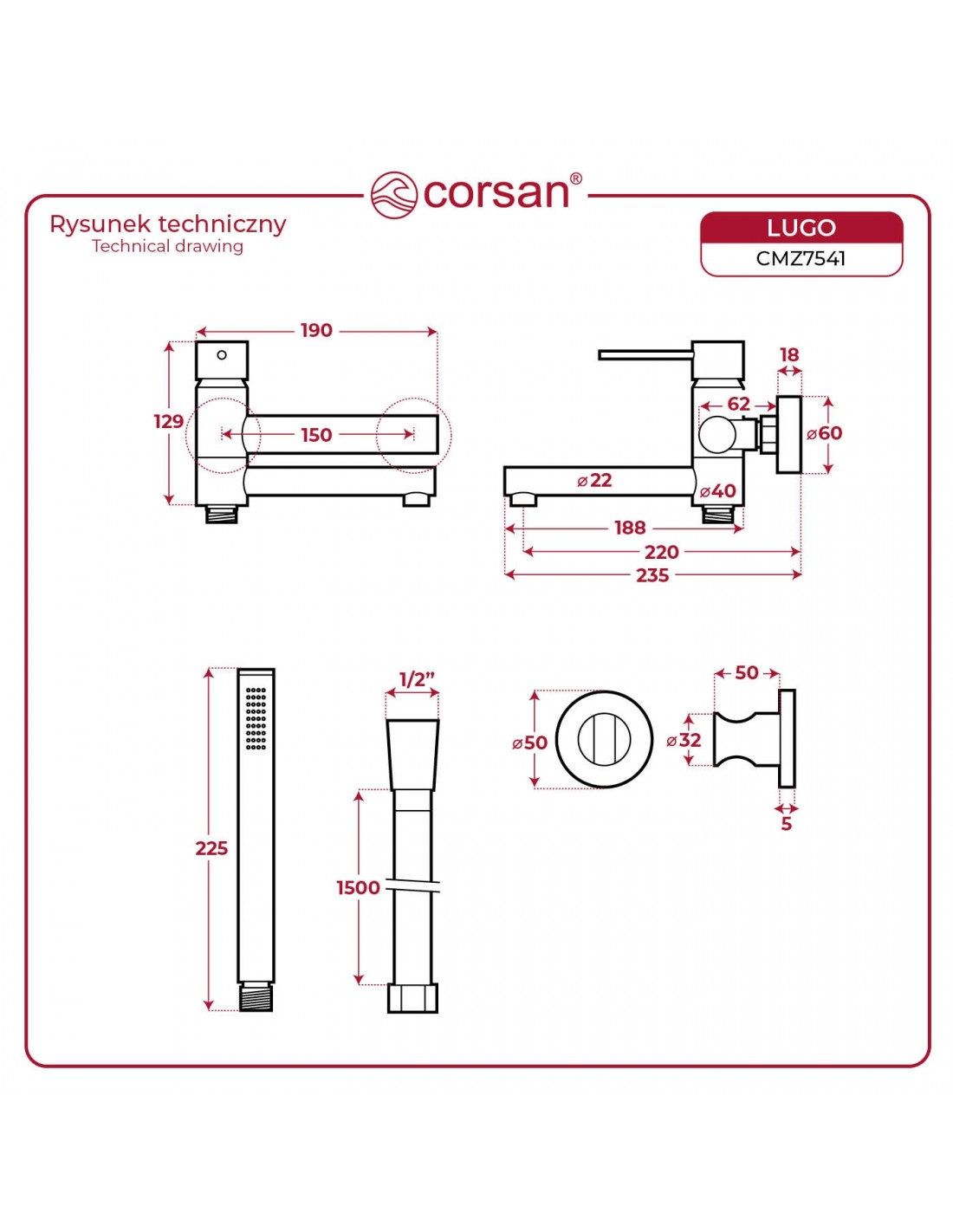 Specyfikacje techniczneBateria wannowa ścienna Lugo marki Corsan – Wykończenie stal szczotkowana