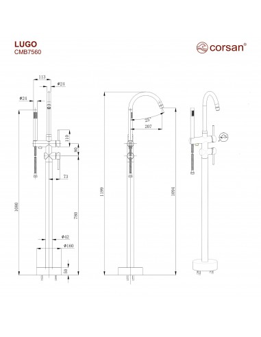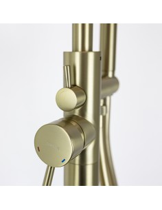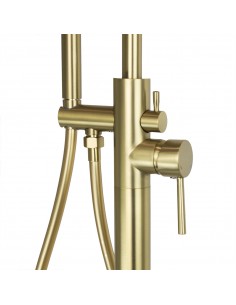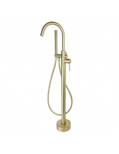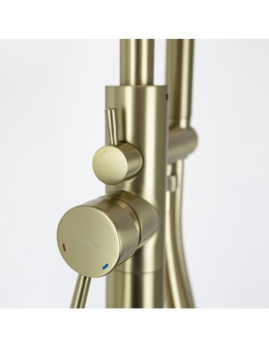 Złota bateria wannowa wolnostojąca Lugo marki Corsan. Bateria wolnostojąca to eleganckie rozwiązanie stosowane przy wannach wolnostojących. Montowana bezpośrednio do podłogi w dowolnym miejscu daje wyjątkowe możliwości aranżacyjne i umożliwia montaż wanny w dowolnej odległości od ściany. Dobrze znana i świetnie oceniana seria Lugo to nowoczesny design i świetna jakość materiałów. Ta piękna bateria wykonana została w całości z mosiądzu i stali w wykończeniu szczotkowanym i kolorze złotym. Wyposażona została w obrotową wylewkę oraz słuchawkę prysznicową. Dzięki technologii Anti Wipe jest łatwa do utrzymania w czystości i nie wymaga szorowania. Zastosowana ceramiczna głowica mieszaczowa zapewnia bezproblemowe użytkowanie przez lata i płynną regulację temperatury wody. W słuchawce zastosowano specjalne silikonowe dysze, które ograniczają możliwość osadzania się kamienia blokującego przepływ wody. W zestawie znajdziesz niezbędne elementy montażowe. Całkowita wysokość baterii to 112 cm. Podłączenie standardowe na 1/2 cala. Solidny montaż na 3 metalowe kotwy do betonu zapewni odpowiednią stabilność.