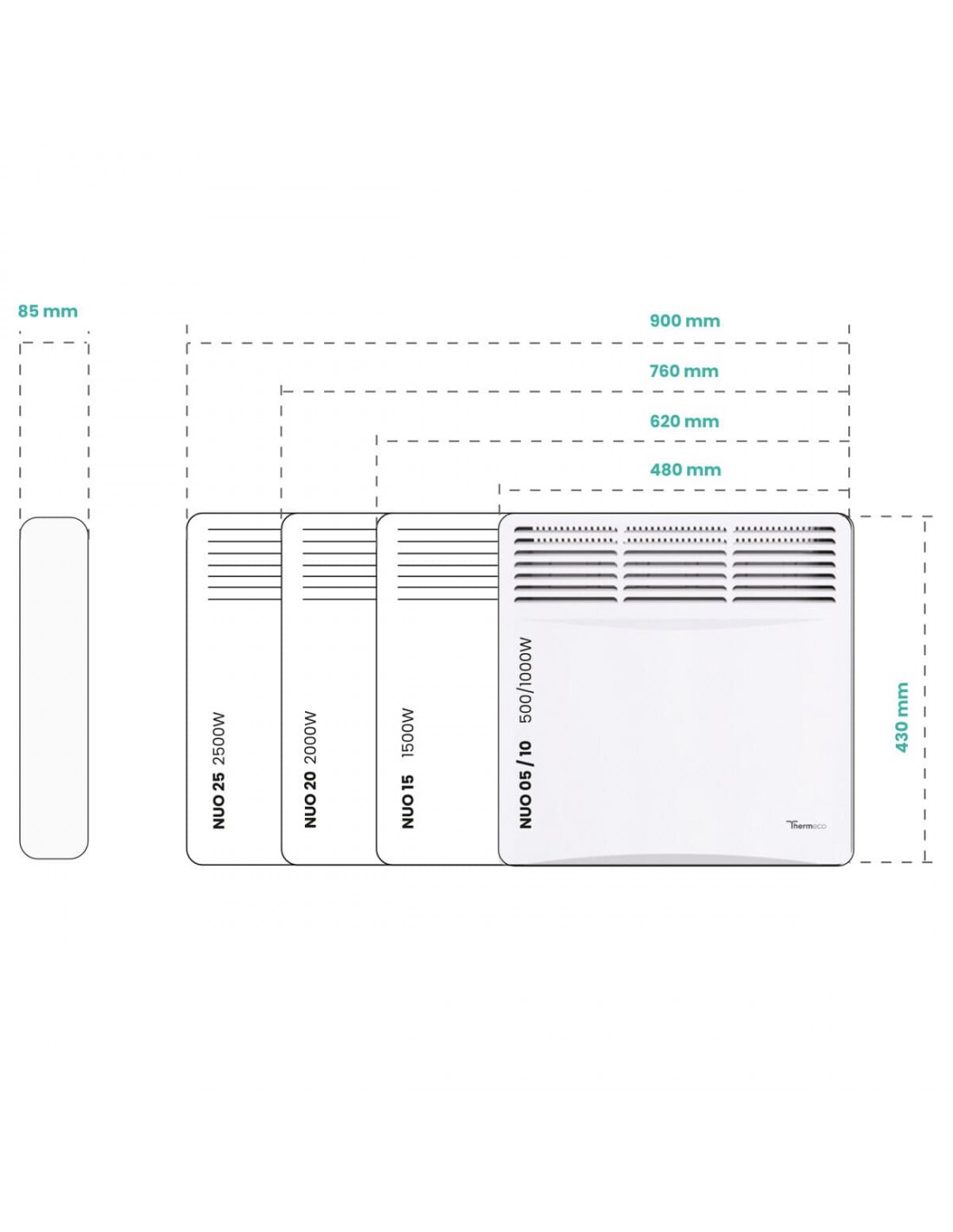 Thermeco NUO 05 to nowoczesny i elegancki grzejnik konwektorowy, który łączy prostotę obsługi z solidnym wykonaniem. Obudowa z lakierowanej blachy odpornej na wysokie temperatury gwarantuje trwałość, a cicha praca sprawia, że urządzenie doskonale sprawdza się w każdym wnętrzu.