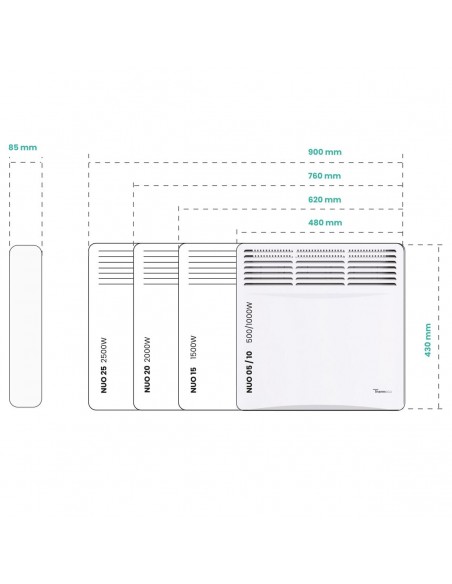 Thermeco NUO 15 to nowoczesny i elegancki grzejnik konwektorowy, który łączy prostotę obsługi z solidnym wykonaniem. Obudowa z lakierowanej blachy odpornej na wysokie temperatury gwarantuje trwałość, a cicha praca sprawia, że urządzenie doskonale sprawdza się w każdym wnętrzu.