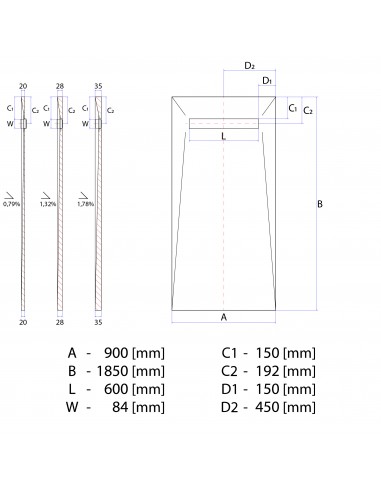 Rysunek techniczny: Brodzik pod mikrocement 90x185 MCR Sirocco