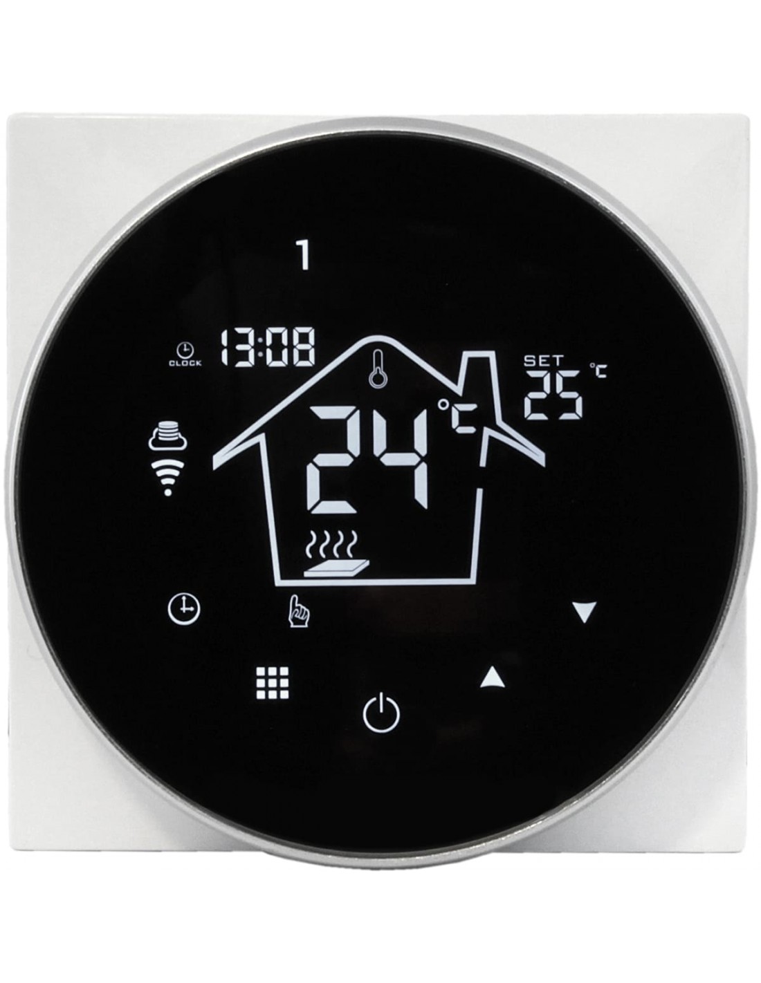 Dużym ułatwieniem w codziennym użytkowaniu są czytelne ikony na ekranie informujące m.in. o połączeniu WiFi oraz o tym, z którego czujnika temperatury korzysta urządzenie. Panel dotykowy jest prosty w obsłudze, a metalowa obudowa wokół wyświetlacza nadaje termostatowi elegancki wygląd pasujący do nowoczesnych wnętrz.