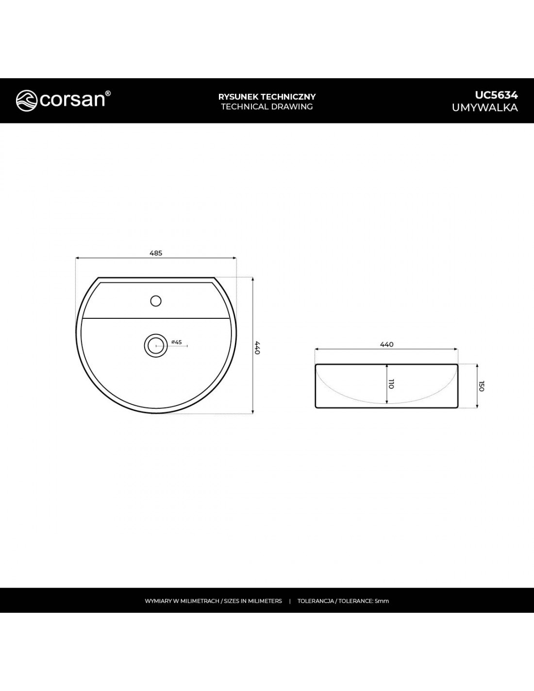 Umywalka nablatowa Corsan Lugo wyróżnia się półokrągłą formą i wymiarami 485 × 435 × 155 mm, które zapewniają wygodę użytkowania przy zachowaniu lekkiego, minimalistycznego charakteru. Jej delikatnie zaokrąglona linia wprowadza do łazienki harmonię i miękkość, doskonale komponując się z nowoczesnymi aranżacjami.