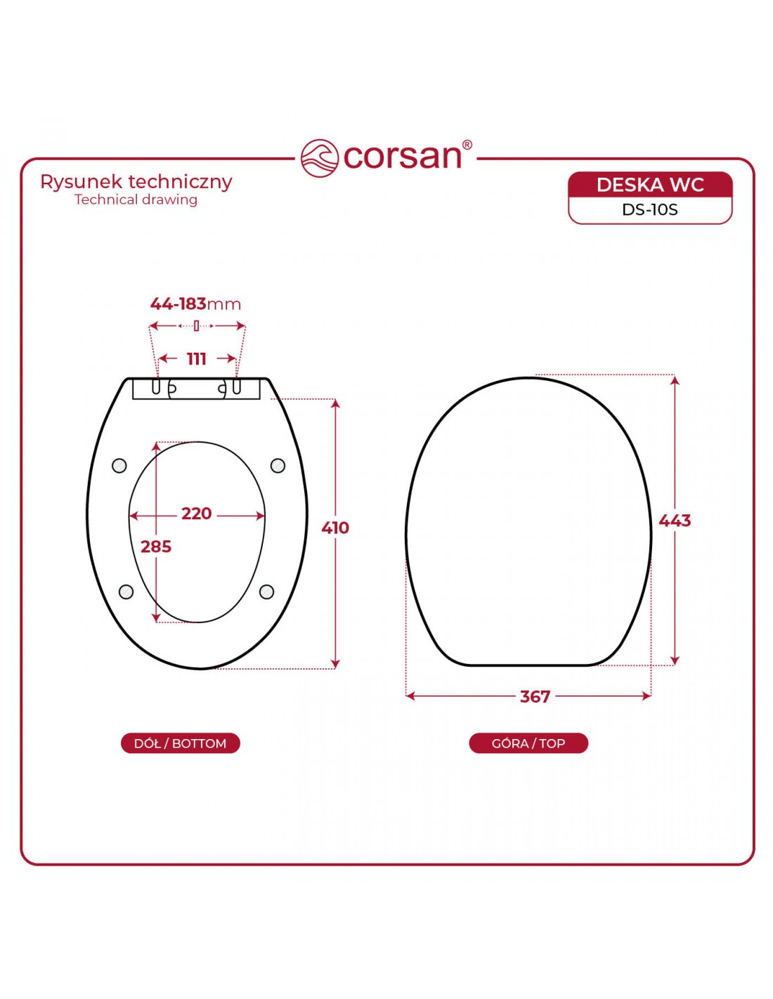 Pozornie drobny dodatek – a jednak jego obecność w łazience robi różnicę. Deska sedesowa DS‑10S to nie tylko klasyczna deska – to detale dopracowane do perfekcji: cichy mechanizm, miły materiał, dzięki któremu nawet najzwyklejsza chwila staje się przyjemniejsza. System wolnego opadania powoduje, że deska opada powoli, bez hałasu i nieoczekiwanych zamknięć. Mimo subtelnej, slim formy (~8 mm grubości pokrywy i siedziska), DS‑10S nie traci ani na solidności, ani na stabilnym osadzeniu. Trzpienie regulowane w zakresie 135–175 mm pozwalają dobrze dopasować deskę do większości toalet – niezależnie od producenta. Wykonanie z duroplastu (utwardzanego polimeru) gwarantuje odporność na zarysowania, przebarwienia i promieniowanie UV. Materiał przypomina ceramikę – jest chłodny, nieporowaty, trwały i łatwy w czyszczeniu. A technologia Corsan Anti‑Wipe sprawia, że smugi i osady nie zyskują miejsca na tej powierzchni. Antybakteryjna warstwa z jonami srebra minimalizuje rozwój drobnoustrojów. Długość 445 mm i szerokość 367 mm czynią DS‑10S prawdziwie uniwersalną – pasuje do misek stojących i wiszących, różnych marek. A wypinany system, otwierany jednym kliknięciem, upraszcza wielokrotne zdejmowanie deski – np. za każdym razem, gdy chcesz dokładnie wysprzątać toaletę