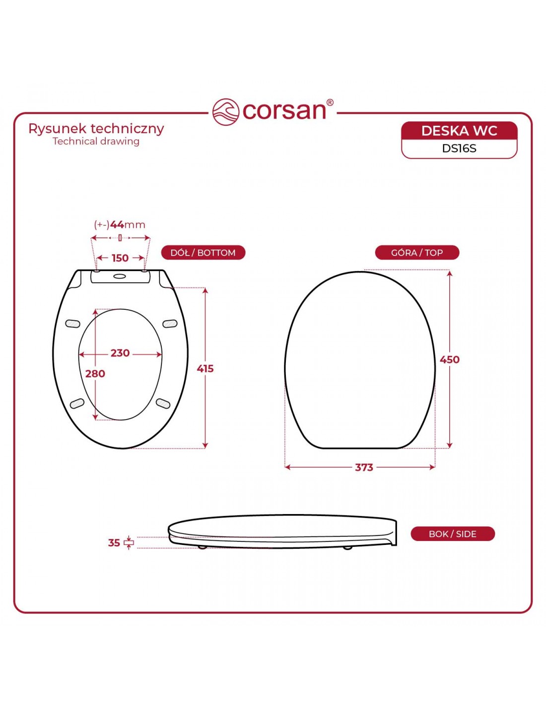 Choć to tylko akcesorium, może całkowicie zmienić Twoje wyobrażenie o toalecie. Corsan DS‑16S to uniwersalna deska wolnoopadająca, która łączy minimalistyczną elegancję z codzienną wygodą i jakością, na którą warto zwrócić uwagę. Wyposażona w solidne, stalowe uchwyty i zawiasy, deska DS‑16S gwarantuje stabilne osadzenie na muszli – niezależnie od rodzaju WC. Zakres regulowanych trzpieni od 80 do 188 mm sprawia, że dopasujesz ją do większości standardowych modeli. Montaż jest szybki, a demontaż tak prosty jak kliknięcie – co ułatwia czyszczenie i pielęgnację. System wolnego opadania zapewnia, że deska i pokrywa nie zamkną się z hukiem. Wystarczy lekkie pchnięcie i wszystko opada delikatnie i płynnie. To szczególnie ważne nocą, gdy cenisz spokój i nie chcesz budzić domowników. Deskę DS‑16S wykonano z duroplastu – materiału twardego, przypominającego ceramikę, a przy tym przyjemnego w dotyku. Ta półmatowa, biała powierzchnia nie wchłania zapachów i promieniowania UV, a dodatkowa technologia Anti Wipe chroni ją przed smugami i zaciekami, ułatwiając utrzymanie czystości. Antybakteryjna powłoka z jonami srebra neutralizuje rozwój bakterii – co czyni deskę bardziej higieniczną bez dodatkowego wysiłku z Twojej strony. Optymalne wymiary (450 × 373 mm) zapewniają wygodę i estetykę w większości łazienek. Deska DS‑16S jest naprawdę uniwersalna – pasuje zarówno do toalet wiszących, jak i stojących. Jest lekka (ok. 2,5 kg), może być wypinana i łatwo regulowana, a dzięki regulowanym zawiasom dostosujesz ją precyzyjnie do swojego WC.