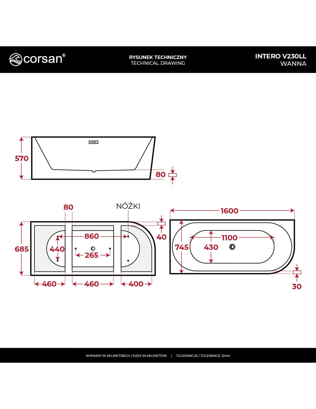 Wanna narożna INTERO V230LLWH 160 cm Montaż lewostronny Przelew szczelinowy Korek klik klak Biały