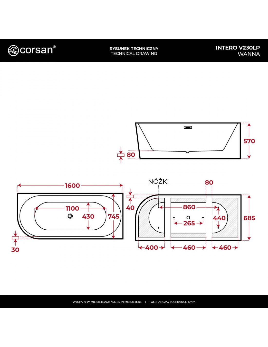 Wanna narożna INTERO V230LPCH 160 cm Montaż prawostronny Przelew szczelinowy Korek klik klak Chrom