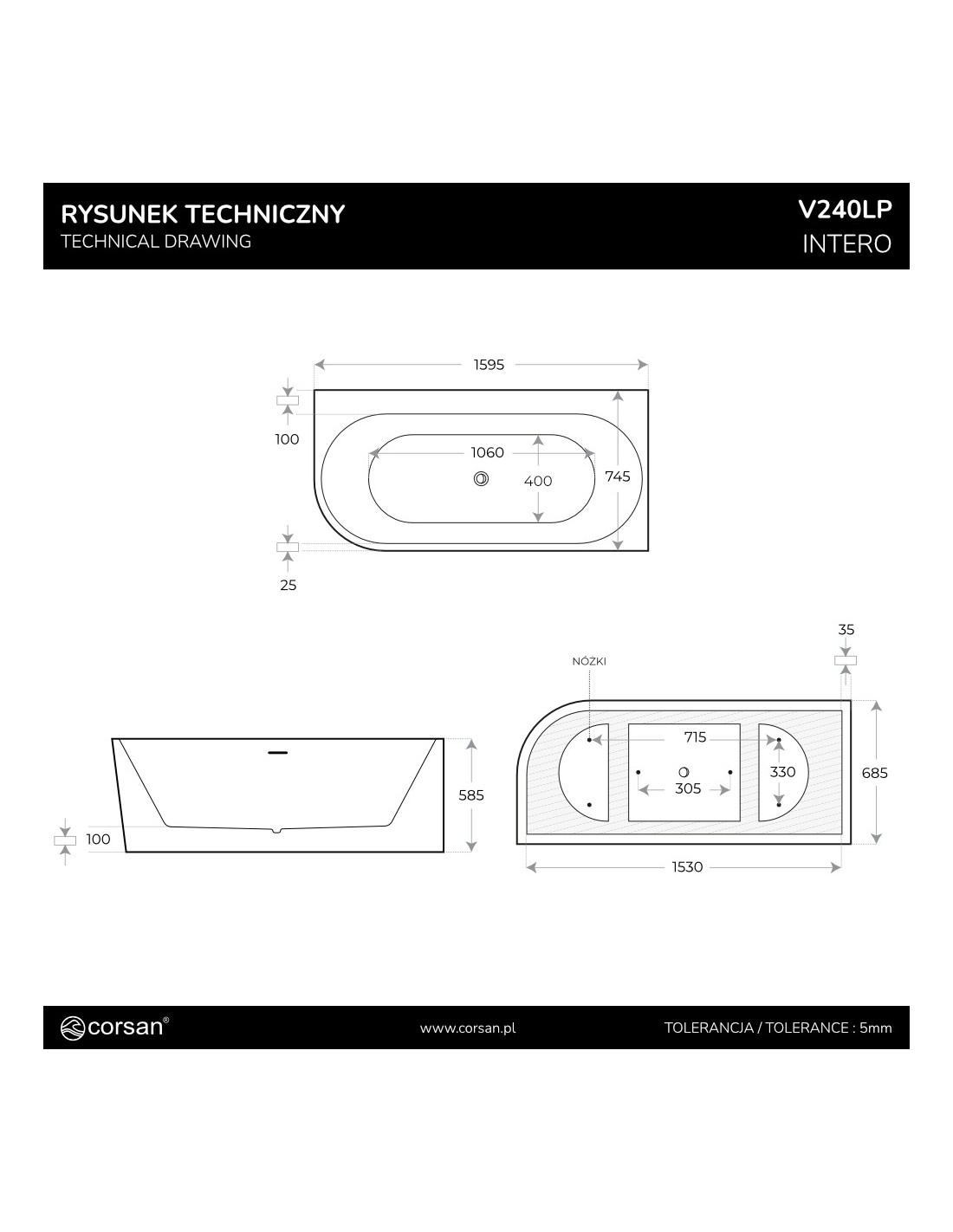 Wanna narożna INTERO V240LPCH 160 cm Montaż prawostronny Przelew szczelinowy Korek klik klak Chrom