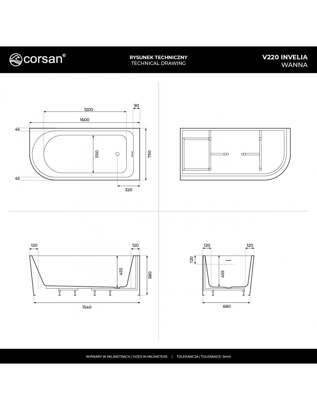 Specyfikacje techniczneCorsan INVELIA to narożna wanna o długości 160 cm, zaprojektowana z myślą o montażu parawanu. Monolityczna konstrukcja bez widocznych łączeń oraz smukłe krawędzie nadają łazience minimalistyczny i nowoczesny charakter. Wersja prawostronna pozwala na idealne dopasowanie do układu wnętrza.