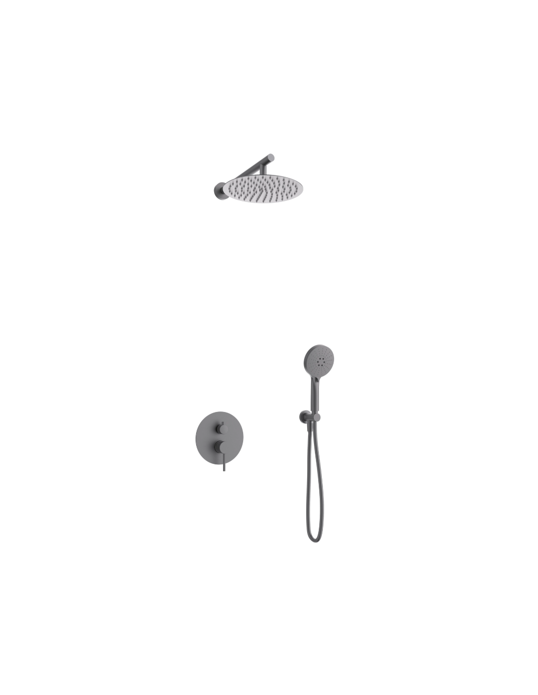 Sercem kompletu jest bateria podtynkowa z dwudrożnym mieszaczem, umożliwiająca wygodne przełączanie między deszczownicą a słuchawką prysznicową. Maskownica w kolorze gunmetal podkreśla minimalistyczny wygląd, a technologie Eco Saving i Anti Wipe ułatwiają codzienne użytkowanie – ograniczając zużycie wody i zapobiegając powstawaniu zacieków.