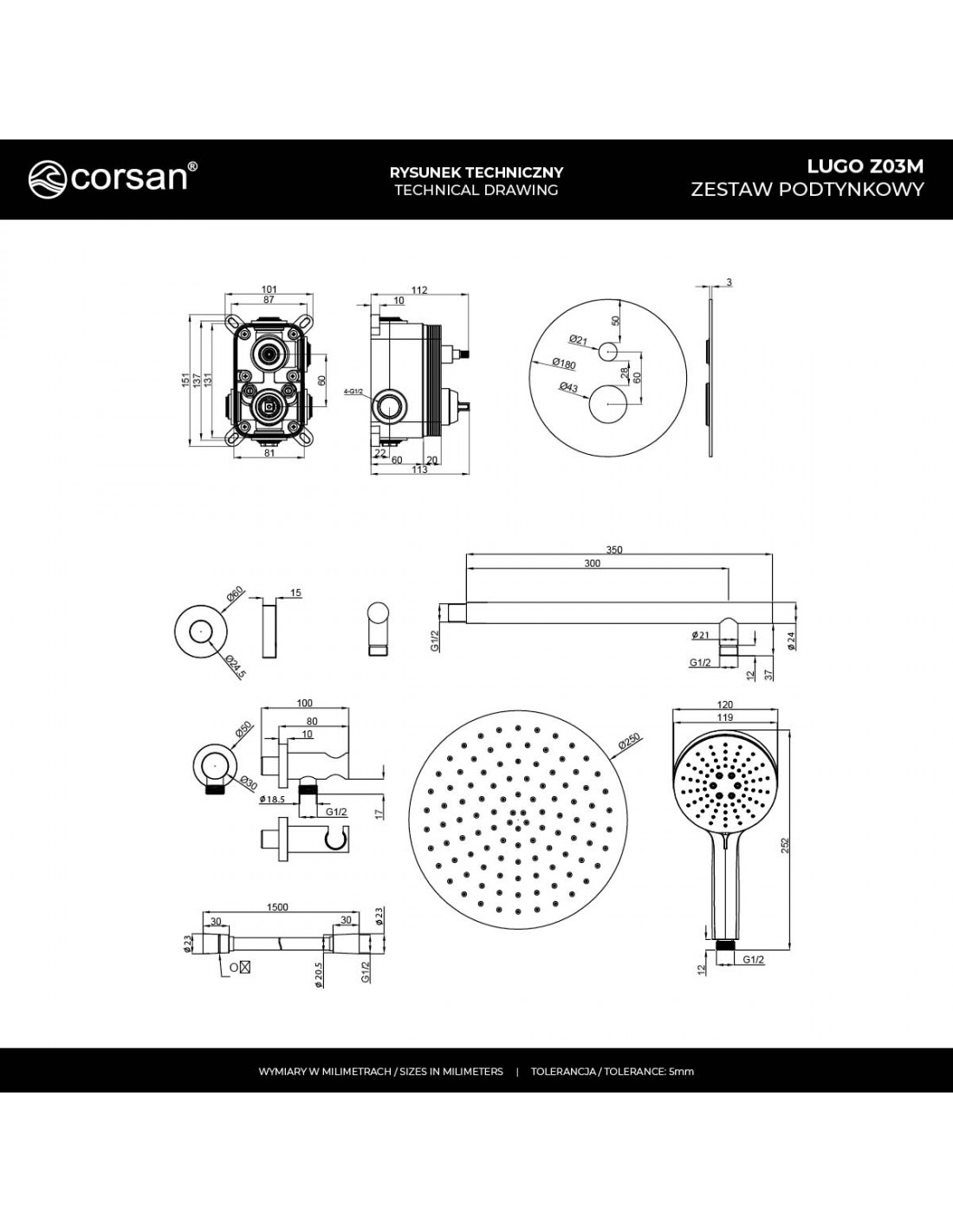 Zestaw prysznicowy Corsan Ango Z01MGM z deszczownicą 25 cm, baterią podtynkową i prysznicem