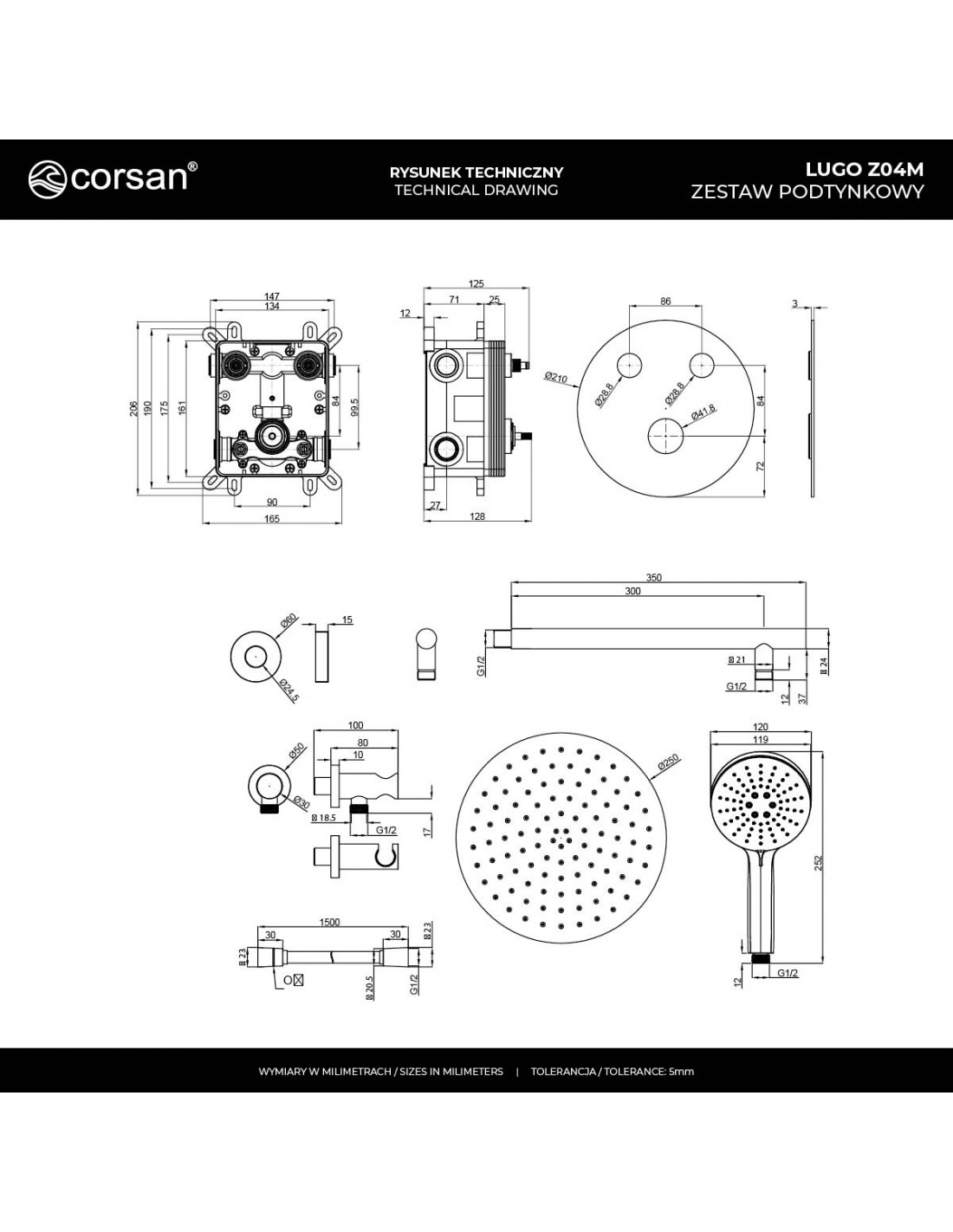 Zestaw prysznicowy LUGO Z04MGL Deszczownica 25cm Mieszacz Słuchawka prysznicowa Złoto