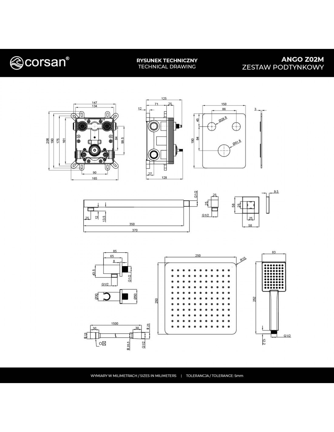 Zestaw prysznicowy podtynkowy ANGO Z02MCH Deszczownica 25cm Mieszacz Słuchawka prysznicowa Chrom