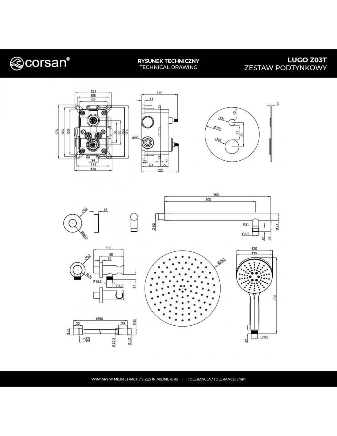 Zestaw prysznicowy podtynkowy LUGO Z03TBGL Deszczownica 25cm Termostat Słuchawka prysznicowa Złoto szczotkowane